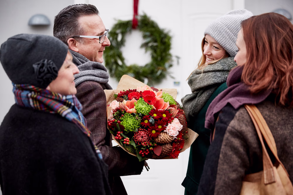 Don’t hand over flowers while standing on the doorstep or still in the hallway. The best moment is after you’ve taken off your outerwear and been invited into the room where the dinner or celebration will take place.